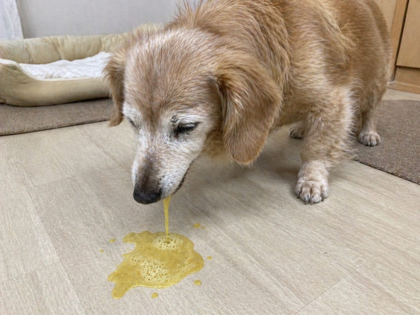 朝起きたら、床に黄色い液体が吐かれていた。
